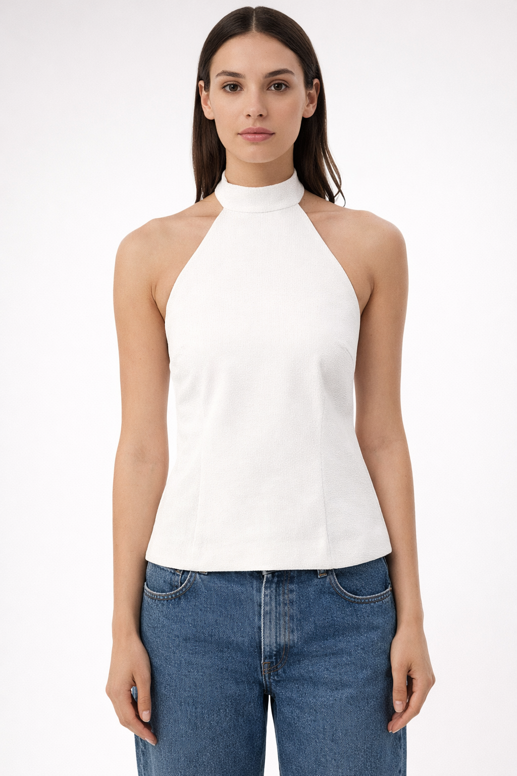 This white sleeveless top features a halter neckline with a high, close-fitting collar that wraps around the neck. The front panel is smooth and structured, extending from the collar down to a straight hem at the waist. The armholes are deeply cut, exposing the shoulders and upper back area. The silhouette appears slightly A-line, with a gentle flare from the bust to the hem. The surface looks clean and untextured, with a minimal and streamlined design.