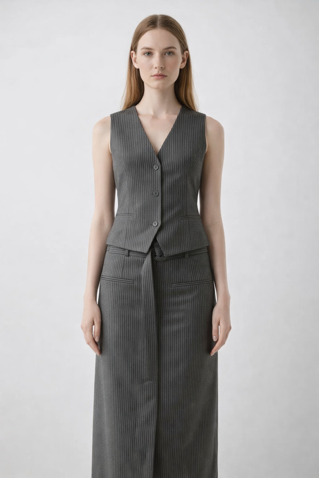 This sleeveless tailored vest features a classic grey pinstripe pattern for a refined, structured look. Designed with a deep V-neckline, it creates a sharp, flattering silhouette.